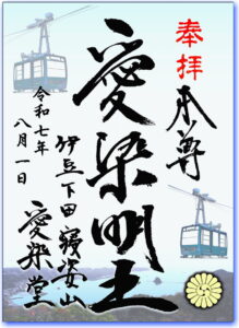 2025.08.14 お知らせ 期間限定! ロープウェイの御朱印 「下田ロープウェイ」と「下田港」の御朱印、人気です。 下田港をバックに、ロープウェイが書かれた、伊豆下田の楽しい旅の思い出となる1枚です。 きっぷ売り場にて販売中。 1枚 300円
