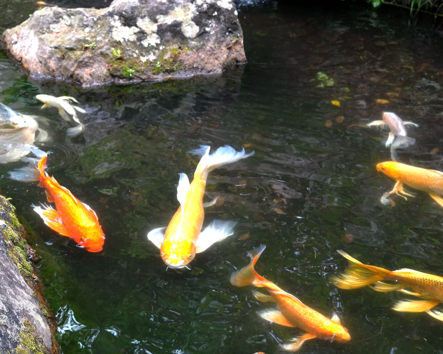遊歩道にある、ひょうたん池 の中には、ヒレ長錦鯉が泳いでいます。